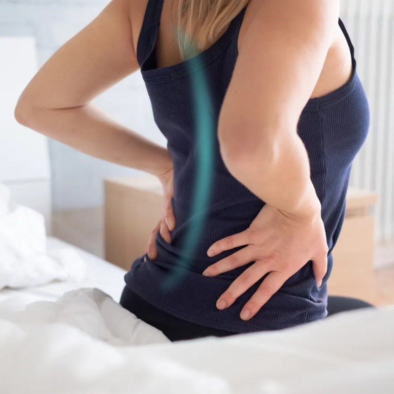 The excessive pressure suffered by a hunched back over time, causes our vertebrae to collapse & squeeze the spinal discs between them. In turn, those bulge out of place & start pinching the nerves around our spine, such as the sciatic nerve, which sends radiating pain from our lower back, all the way down one of both legs.
